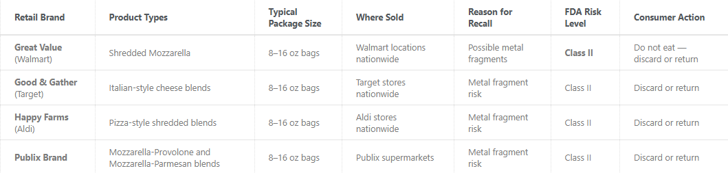 Retailers connected to these recalled products include Walmart, Target, Aldi, and Publix, along with additional grocery chains carrying private-label shredded cheeses supplied by Great Lakes Cheese.