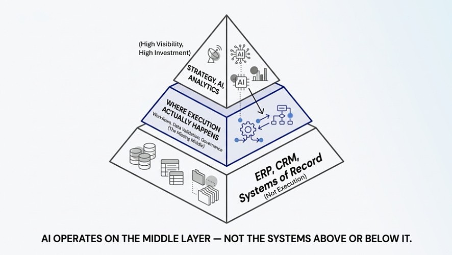 Most organizations invest heavily at two levels. At the top, they define strategy, goals, and transformation initiatives, including artificial intelligence. At the bottom, they rely on systems of record such as ERP and CRM platforms to store and process transactions.