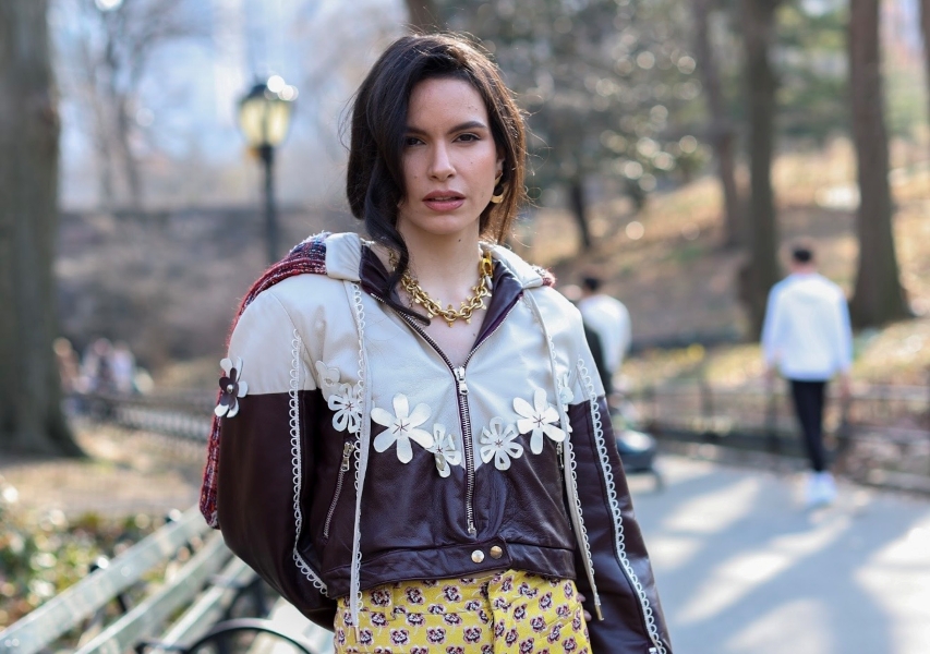 As the story progresses, layering becomes more pronounced. A cropped leather jacket by ESQUE/BY, detailed with floral elements and paired with the same yellow shorts, shifts the tone. Suddenly, the softness of the initial look is interrupted by something more assertive. The leather introduces weight, while the floral detailing maintains a connection to femininity. This duality, strength without hardness, delicacy without fragility, defines the editorial’s core message.