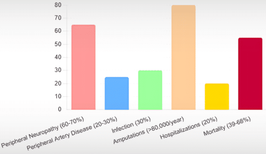 - Peripheral Neuropathy: Affecting around 60-70% of diabetic patients, peripheral neuropathy results in loss of sensation in the feet, making it difficult for individuals to notice injuries or pressure sores.