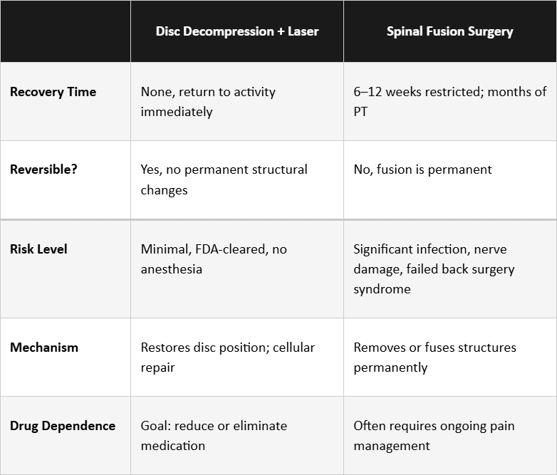 Non-surgical disc decompression combined with Class IV laser therapy is a clinically supported, drug-free alternative to back surgery for patients with herniated discs, sciatica, degenerative disc disease, and chronic nerve pain. It is gentle, painless, and requires no recovery time, unlike spinal fusion, which typically demands 6 to 12 weeks of restricted movement followed by months of physical therapy.