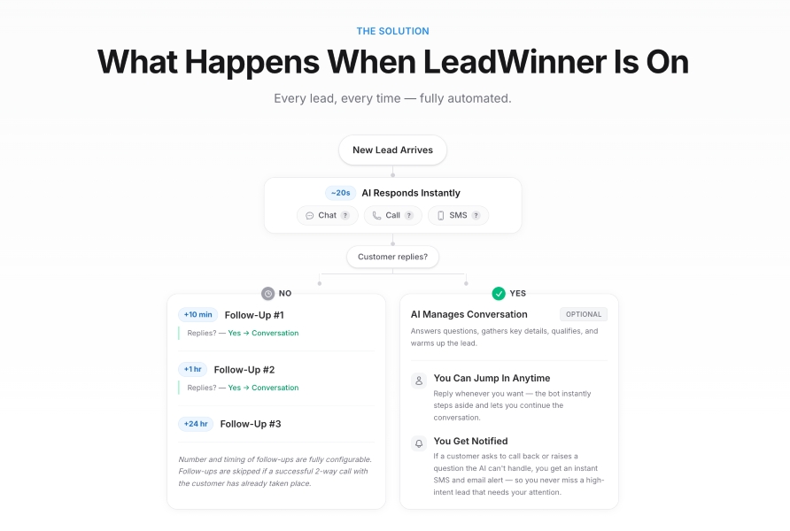 LeadWinner.AI positions itself not as a replacement for a sales team but as the layer that handles the speed and consistency that humans structurally cannot. The first response, the overnight follow-up, the weekend inquiry: these get answered. The human closes the deal.